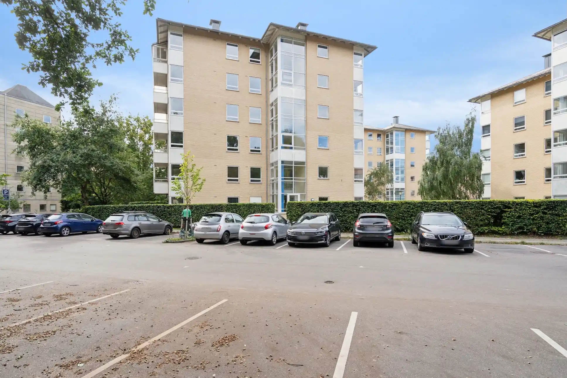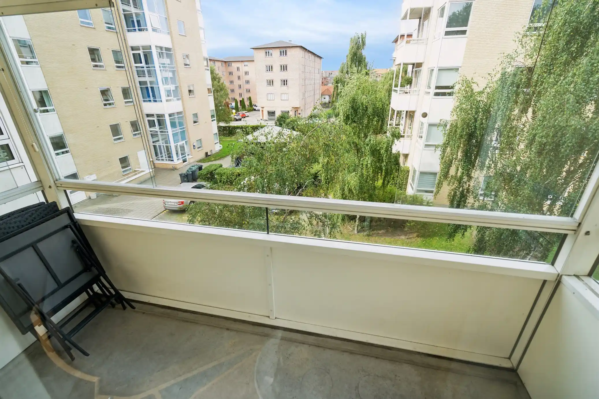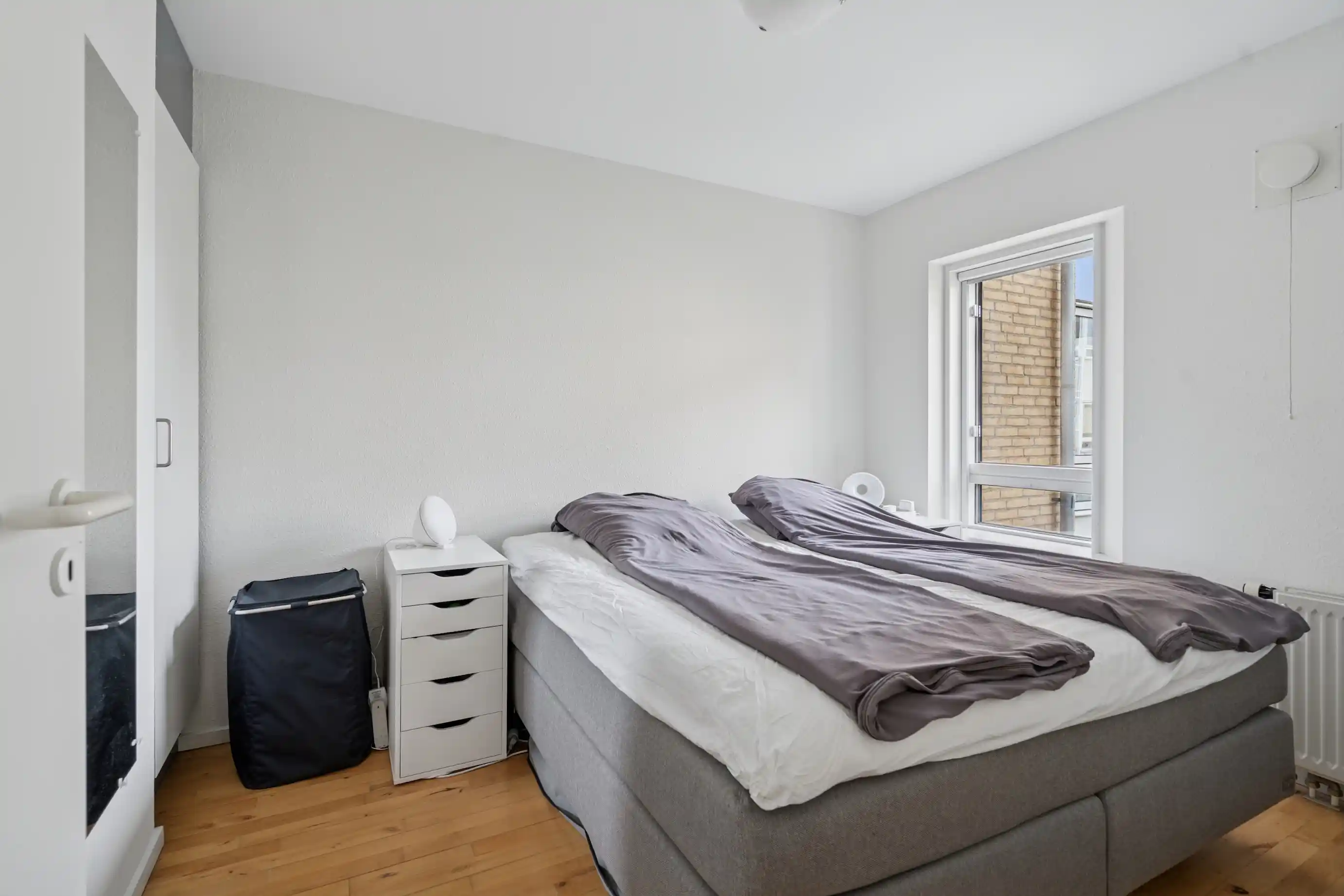 Soveværelset har god plads med en stor dobbeltseng og opbevaring, og fra alle rum er der et dejligt lysindfald og udsigt til de grønne omgivelser. Ejendommen er velholdt og byder på en række faciliteter, herunder elevator, fælles gårdanlæg, cykelparkering både i kælder og udenfor samt adgang til fællesvaskeri. Der medfølger også et loft-/kælderrum. Lejligheden udlejes møbleret i 24 måneder med mulighed for forlængelse, og lejer betaler selv for internet.